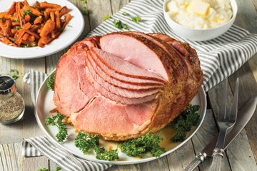 Prepared in our kitchens and spiral sliced. Reheating is required and comes with extra glaze. Offered as a half or quarter sized ham.